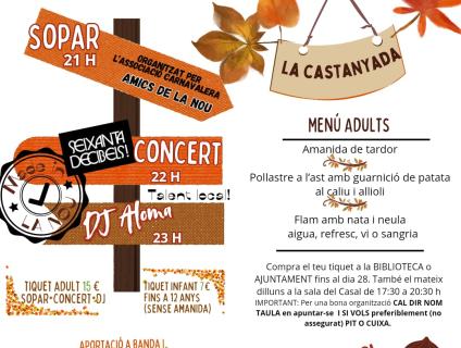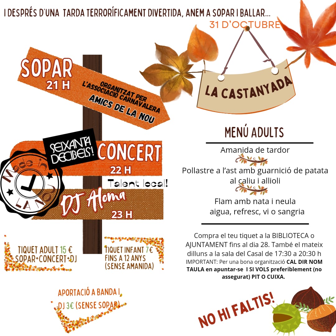A les 21 h, sopar de Castanyada, on els Amics de la Nou ens serviran el sopar.