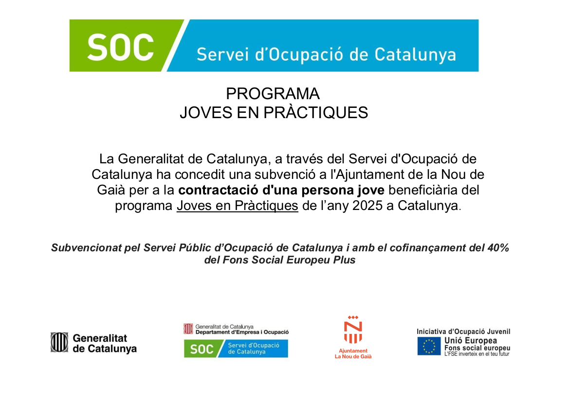La Generalitat de Catalunya ha concedit a l'Ajuntament de la Nou de Gaià un Ajut per import de 23.667,93 € per finançar el contracte de Joves en pràctiques del Servei d'Ocupació de Catalunya 2025.